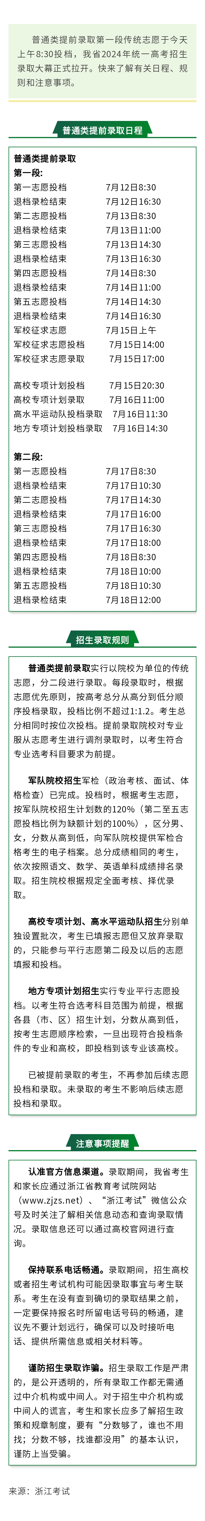 6月29日8:30 —30日17:30 | 普通类提前录取院校志愿填报; 普通类第一段平行志愿填报; 艺术类校考批志愿填报; 艺术类统考批第一段平行志愿填报; 体育类提前录取院校、体育类第一段平行志愿、特招生录取院校志愿填报; 单独考试招生志愿填报; 地方专项计划招生志愿填报; 符合条件考生填报高校专项计划、高水平运动队招生志愿; 浙江警察学院三位一体招生志愿填报 |