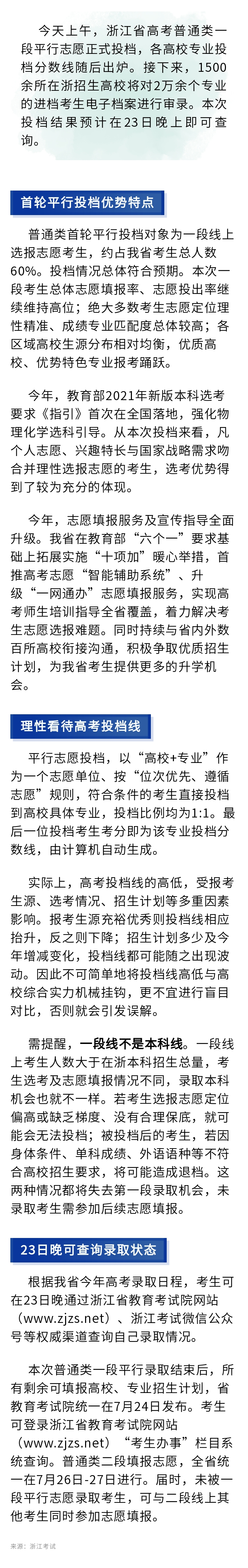 浙江高考普通类一段今日平行投档,录取状态查询→